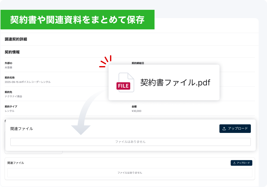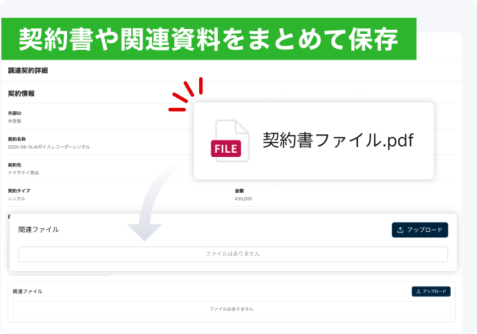 紙の契約書や図面もPDFでアップロード。契約と資産を紐づけて一元管理することで、書類やデータの検索手間を大幅削減します。