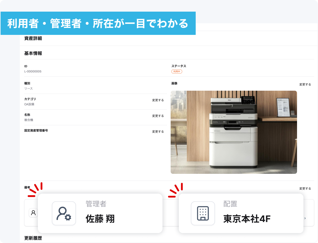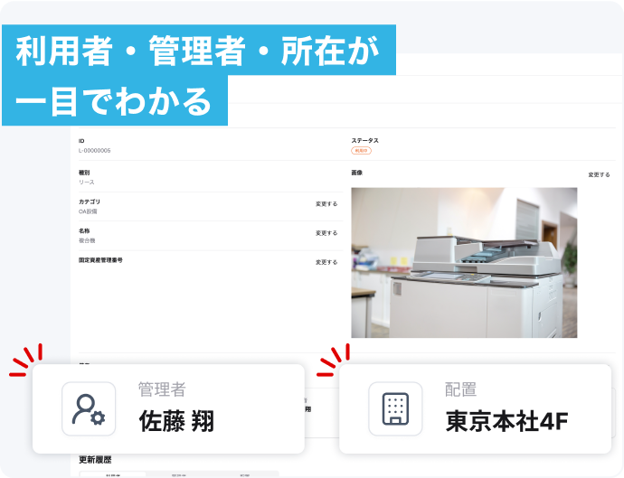 管理者・利用者を明確にすることで、煩雑になりがちな棚卸し作業を一括で管理することが可能となり、必要な資産の所在を容易に確認できるようになります。