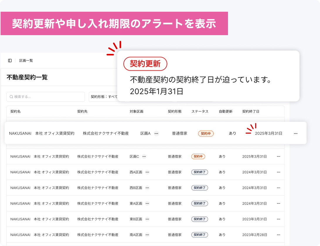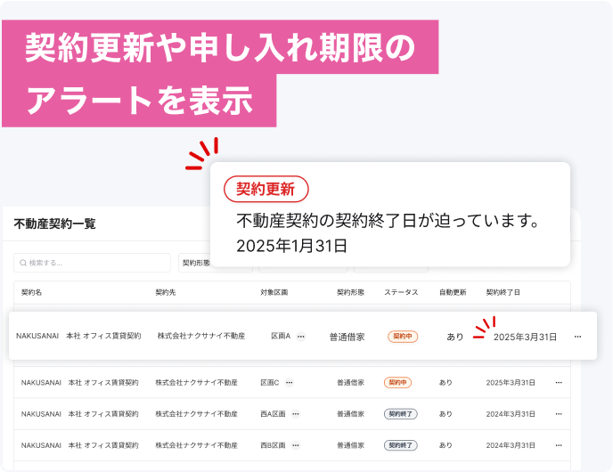 紙や表計算で散在しがちな不動産情報をデジタル管理。検索・更新・共有がスムーズになるだけではなく、自動通知機能により抜け漏れのリスクをなくします。